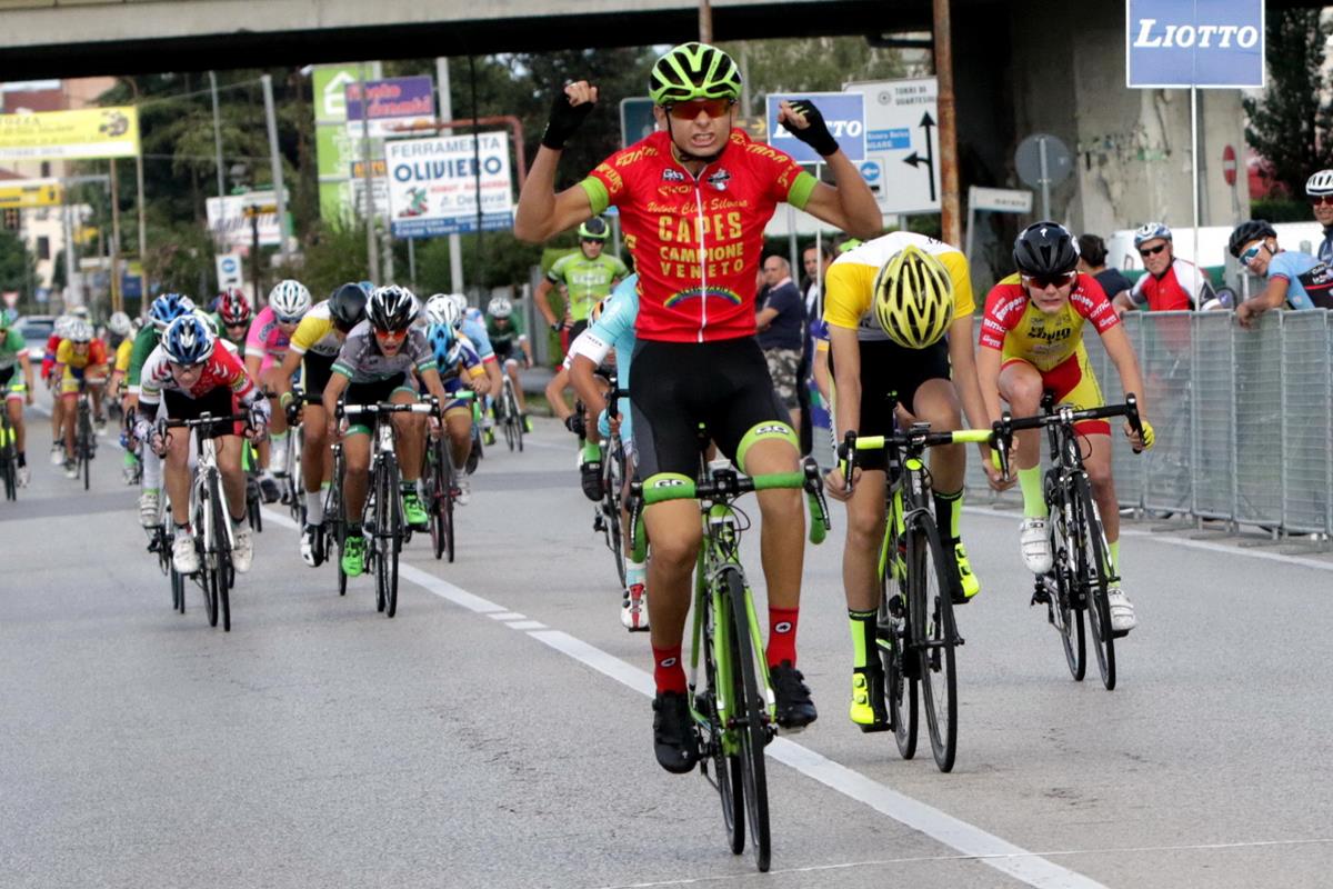 Intanto la gara continua con continui tentativi di fuga, tutti rimasti senza esito. Ma all’ultimo km scatta come una furia il veronese Riccordo Chesini che conquista un lieve margine di vantaggio sul gruppo,e quando parte la volata finale ai 300 metri, il campione veneto Matteo Consolini sembra aver partita vinta il vece riesce solo ad arrivare per un non nulla e conquista il secondo posto.Al termine una ricca premiazione sugella una bella mattinata di sport giovanile.