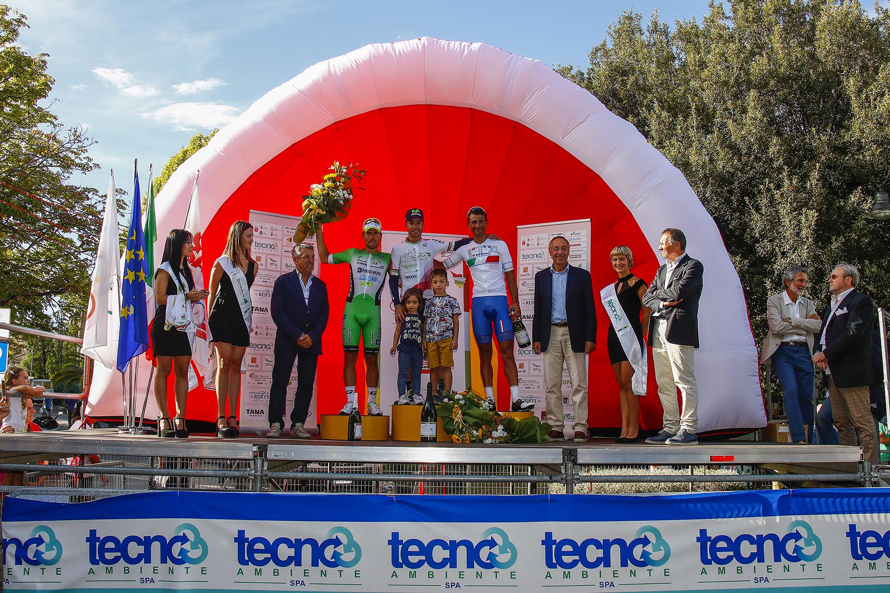 Al passaggio sotto il traguardo di Montecatini, a 15 km dalla conclusione, i sette battistrada conservano un vantaggio di 32” sul gruppo. Sulla salita che porta verso Montecatini Alto forcing di Fabio Aru che riesce a staccare di qualche metro gli avversari. Sul sardo si riporta in prima battuta Visconti, poi riescono a rientrare anche Bennati e Colbrelli che dimostrano di essere in gran condizione, anche in chiave Mondiale.