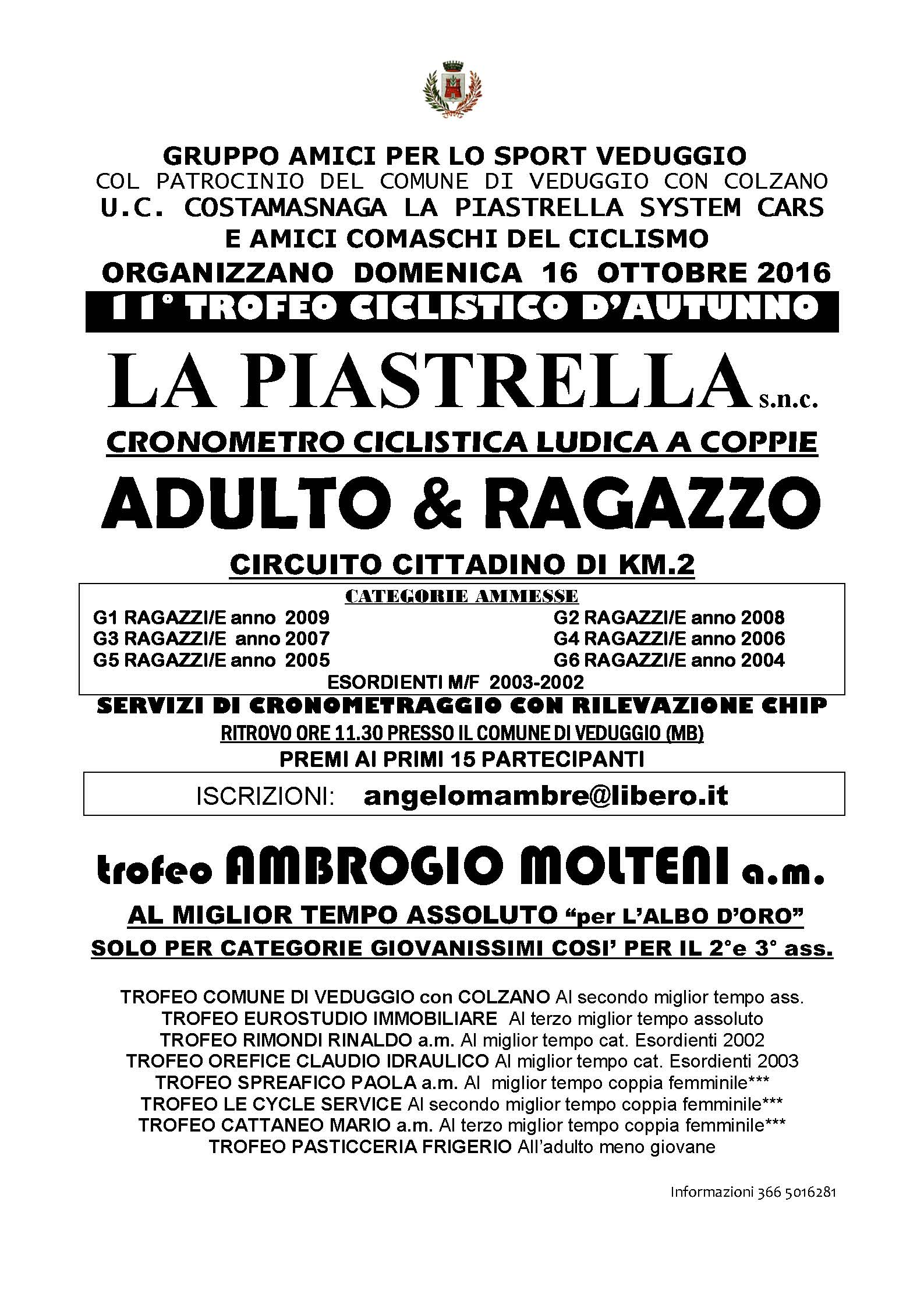 VEDUGGIO CON COLZANO (MB) – Il Gruppo Amici per lo Sport Veduggio, con il patrocinio del Comune di Veduggio con Colzano e la collaborazione dell’Uc Costamasnaga La Piastrella System Cars e Amici Comaschi del Ciclismo organizzano per domenica 16 ottobre 2016 l’11° Trofeo Ciclistico d’Autunno, la cronometro ciclistica ludica a coppie meglio nota come “Adulto & Ragazzo” che si svolgerà su un circuito cittadino di 2 chilometri a Veduggio con Colzano (Monza e Brianza).