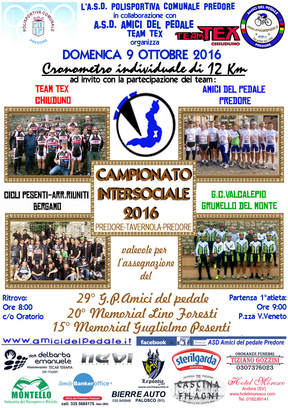 PREDORE (BG) – L’.A.S.D. Polisportiva Comunale Predore (Bg) in collaborazione con l’A.S.D. Amici del Pedale e il Team Tex Chiuduno organizza, domenica 9 Ottobre 2016, il 29° G.P. Amici del Pedale, campionato intersociale ad invito, cronometro individuale valevole per l’assegnazione del 20° Memorial Lino Foresti e 15° Memorial Guglielmo Pesenti.