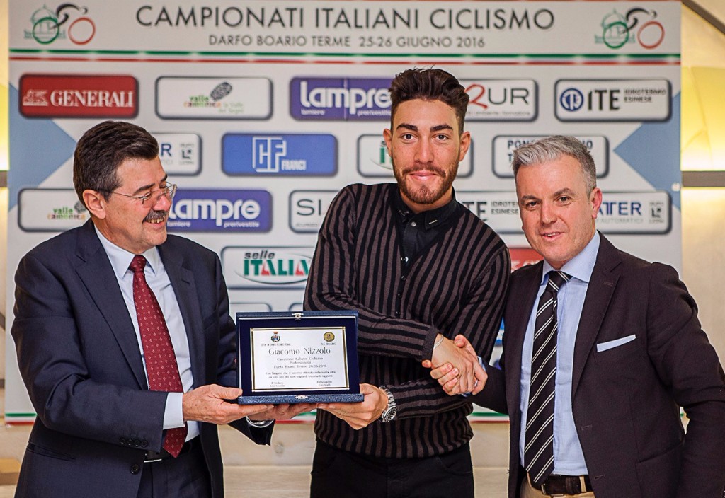 DARFO BOARIO TERME (BS) – Anche a stagione agonistica terminata, continuano ad arrivare riconoscimenti e soddisfazioni per il campione d’Italia Giacomo Nizzolo. Giovedì 1° Dicembre 2016, il 27enne atleta brianzolo della Trek-Segafredo è infatti divenuto cittadino onorario di Darfo Boario Terme (BS), la città nella quale ha conquistato il titolo italiano professionisti il 26 Giugno scorso regolando sul traguardo Gianluca Brambilla.
