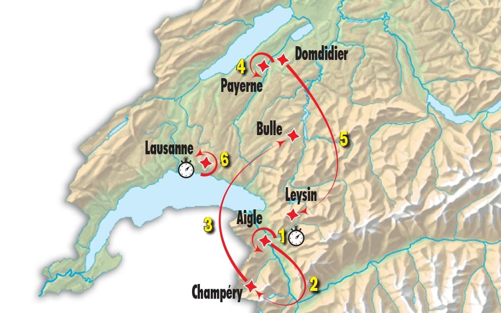 Partenza con il prologo da Aigle, finale con una cronometro a Losanna, passando per Champéry e Bulle, con una tappa in circuito a Payerne, poi Domdidier-Leysin, con ancora due arrivi in salita.