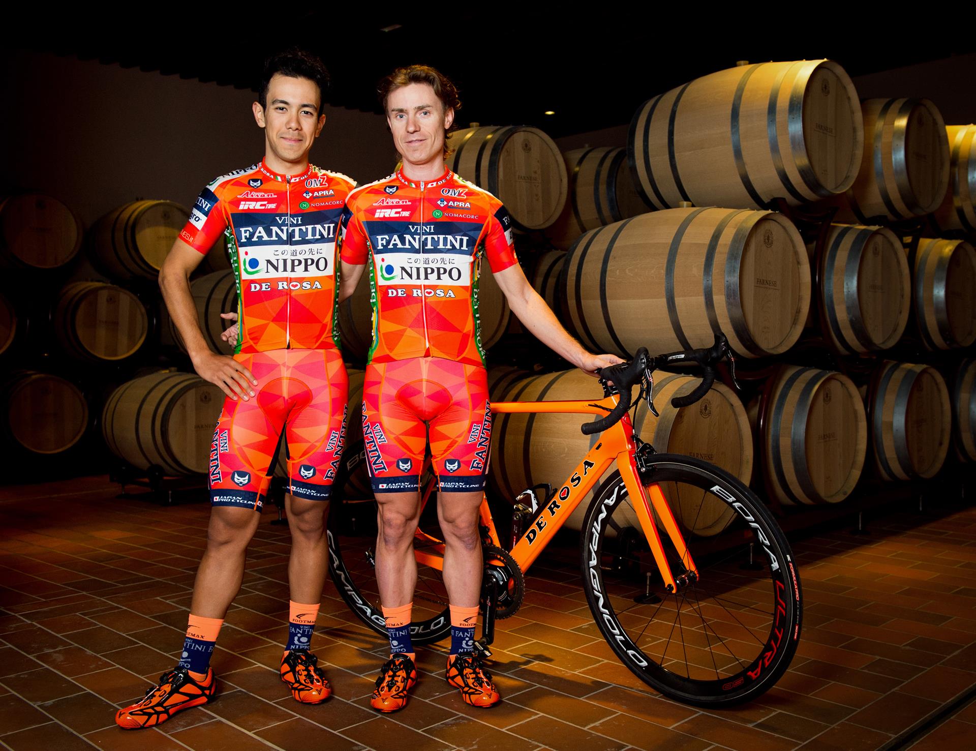 Nello shooting, realizzato nell’esclusiva cantina di Roseto degli Abruzzi di Farnese Vini, il capitano del team Damiano Cunego e il giovante talento Giapponese, Marino Kobayashi, campione nazionale Under23 nipponico, hanno indossato per la prima volta la nuova divisa che, insieme alla bici De Rosa, nel modello Protos 2017 team edition, renderà il team perfettamente riconoscibile in gruppo.