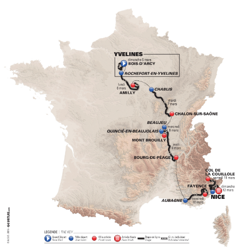 PARIGI (FRANCIA) – È stato svelato oggi il percorso della Parigi – Nizza 2017. La corsa francese WorldTour, organizzata da ASO e giunta alla 75esima edizione, è in programma dal 5 al 12 marzo. Il tracciato si preannuncia vario e impegnativo.