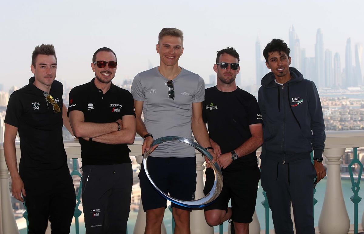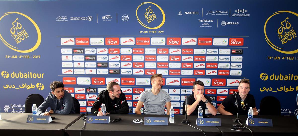 DUBAI (EMIRATI ARABI UNITI) – Scatta questa mattina il Dubai Tour 2017 che metterà a confronto alcuni dei migliori ciclisti del mondo. Ieri, giornata di vigilia molto intensa e ricca di spunti. A partire dalla conferenza stampa di presentazione che ha visto tra i protagonisti alcune delle stelle della corsa. Tra loro il vincitore uscente Marcel Kittel (Quick-Step Floors), il vincitore dell’edizione 2015 del Dubai Tour Mark Cavendish (Team Dimension Data), il campione olimpico su pista Elia Viviani (Team Sky), John Degenkolb (Trek – Segafredo) e il beniamino di casa Yousif Mirza (UAE Abu Dhabi).