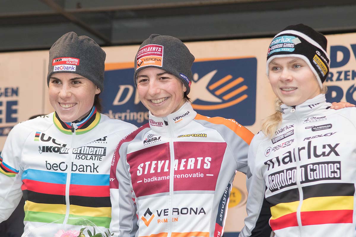 Nella prova Elite donne l’epilogo ha premiato l’olandese Maud Kaptheins (Steylaerts) che ha battuto allo sprint l’iridata Cant e la giovane Laura Verdonschot. Generosa e sfortunata la prestazione dell’altra olandese Sophie De Boer che faceva parte del quartetto di testa, rimasta tagliata fuori dal podio causa una caduta nelle battute finale. Nella top five la statunitense Katherine Compton, rimasta attardata nelle fasi iniziali per un capitombolo di diverse atlete nelle fasi di avvio della gara.