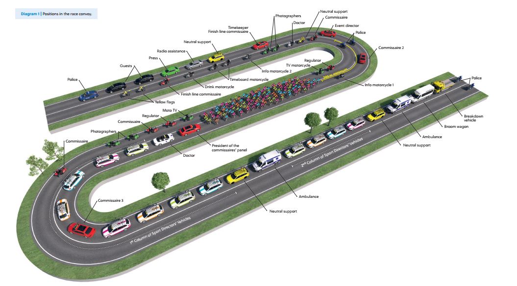 Un vero e proprio manuale dal titolo “Guidelines For Vehicle Circulation In The Race Convoy”, un documento di 38 pagine che, anche con il supporto di illustrazioni, spiega quale deve essere il comportamento dei mezzi in corsa. Vengono fornite indicazioni riguardanti le fasi preliminari, il traffico durante una corsa, misure speciali per le motociclette, accorgimenti in caso di incidenti e nelle cronometro.