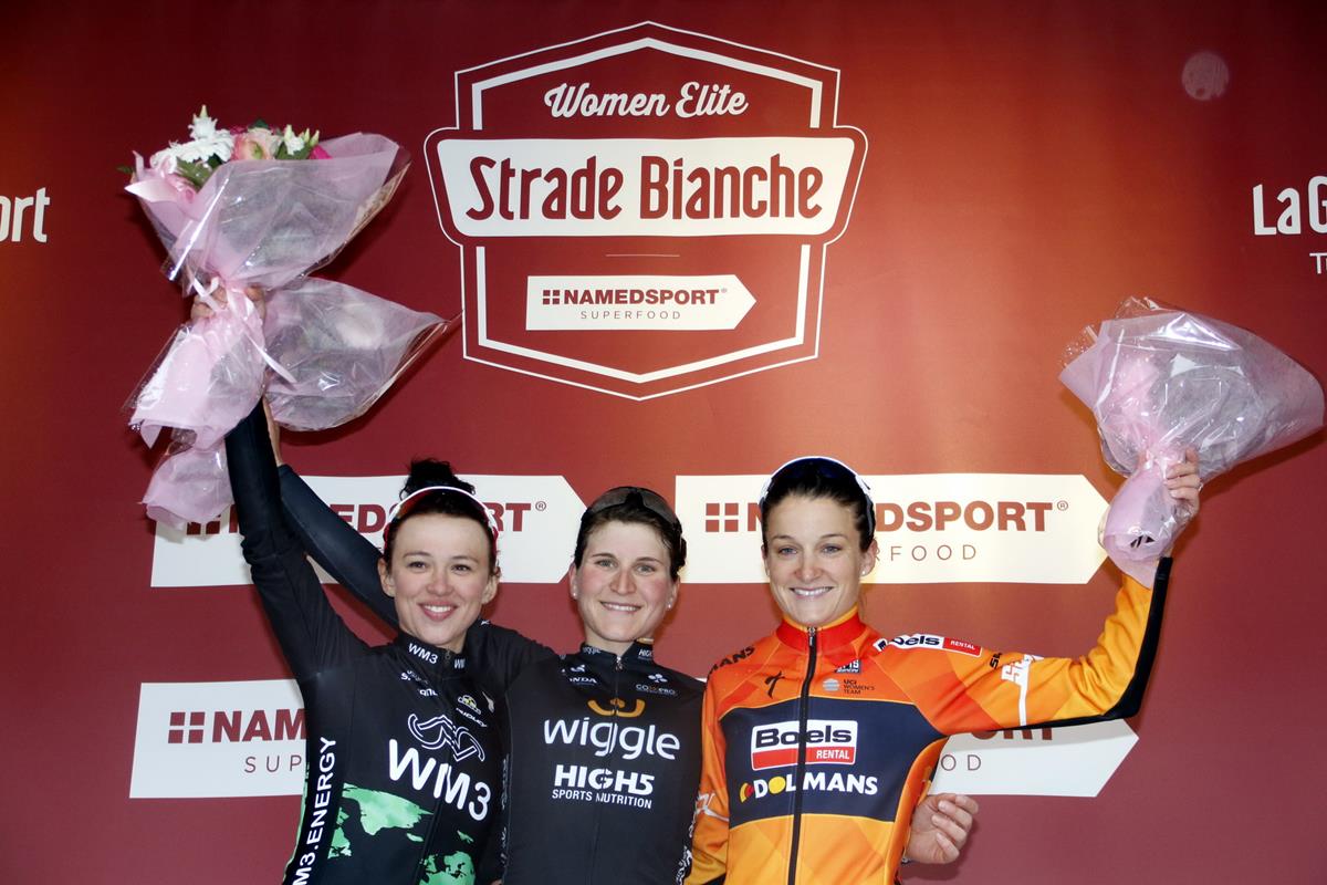 SIENA (SI) – Elisa Longo Borghini (Wiggle-High5) ha vinto una spettacolare edizione della Strade Bianche Women Elite, superando sul traguardo di Siena la polacca Kasia Niewiadoma (WM3) e la britannica Lizzie Deignan (Boels-Dolmans) al termine di una giornata bersagliata dalla pioggia.