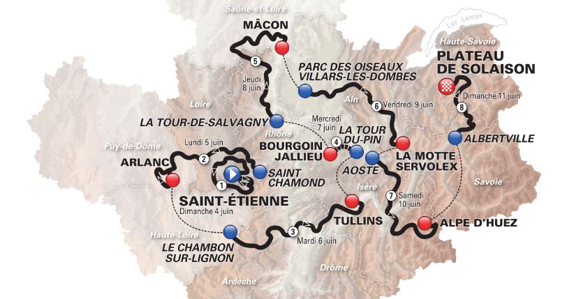 Appuntamento iniziale a Saint-Etienne, una delle capitali francesi del ciclismo, che può vantare 25 passaggi del Tour de France, 59 della Paris-Nice e 24 proprio del Critérium du Dauphiné. La prima tappa avrà un percorso movimentato con la tripla scalata della côte de Rochetaillée nel circuito finale. A seguire, due frazioni dedicate ai velocisti con i traguardi di Arlanc e Tullins, prima della crono di Bourgoin-Jallieu che misura 23,5 km e costringerà a svelare le prime carte ai grandi favoriti.