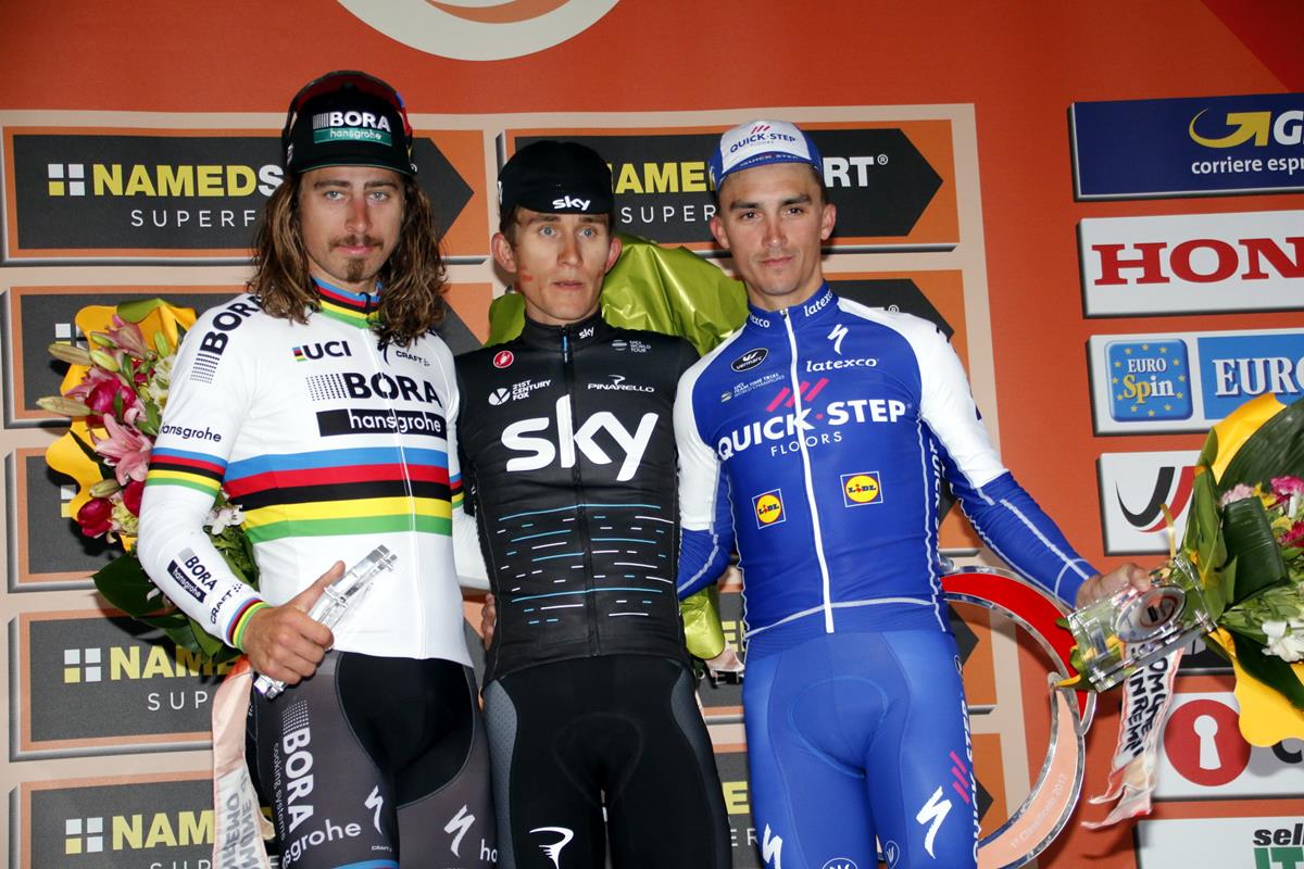 È stato proprio Sagan a dare il là all’azione decisiva. Lo slovacco è uscito dal gruppo appena prima dello scollinamento sul Poggio, l’ultima salita di giornata, e alla sua ruota si sono subito portati anche Kwiatkowski e Alaphilippe.
