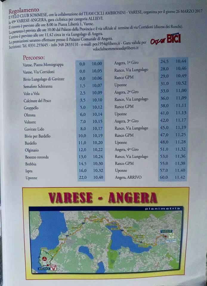 VARESE (VA) – Si può considerare la prima classica di apertura del calendario Allievi è la 49/a Varese-Angera. La manifestazione in linea organizzata dal Velo Club Sommese è in programma la prossima domenica, 26 marzo, partenza alle ore 10 da Varese e, dopo 60 chilometri di gara, arrivo sul lungolago di Angera.