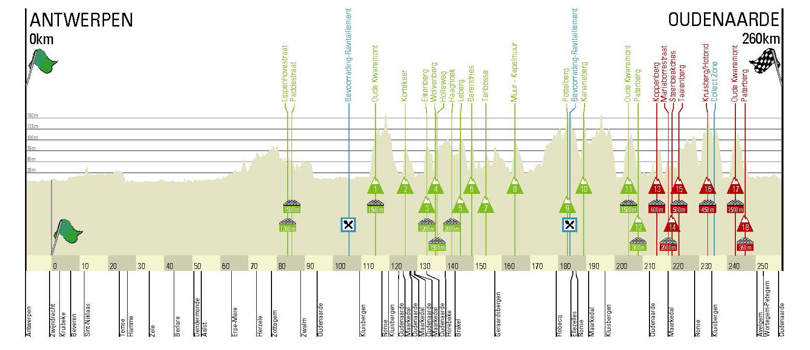 Tra i meno 36 km e i meno 16 km all’arrivo, c’è solo il Kruisberg, ma inizierà a farsi sentire la fatica ed è proprio in questo tratto che potrebbe decidersi la corsa con l’attacco decisivo. Il finale propone di nuovo l’accoppiata Oude Kwaremont-Paterberg, con quest’ultimo muro posto a 12 chilometri dall’arrivo. Il finale è pianeggiante, su asfalto, ed è qui che si deciderà la battaglia.