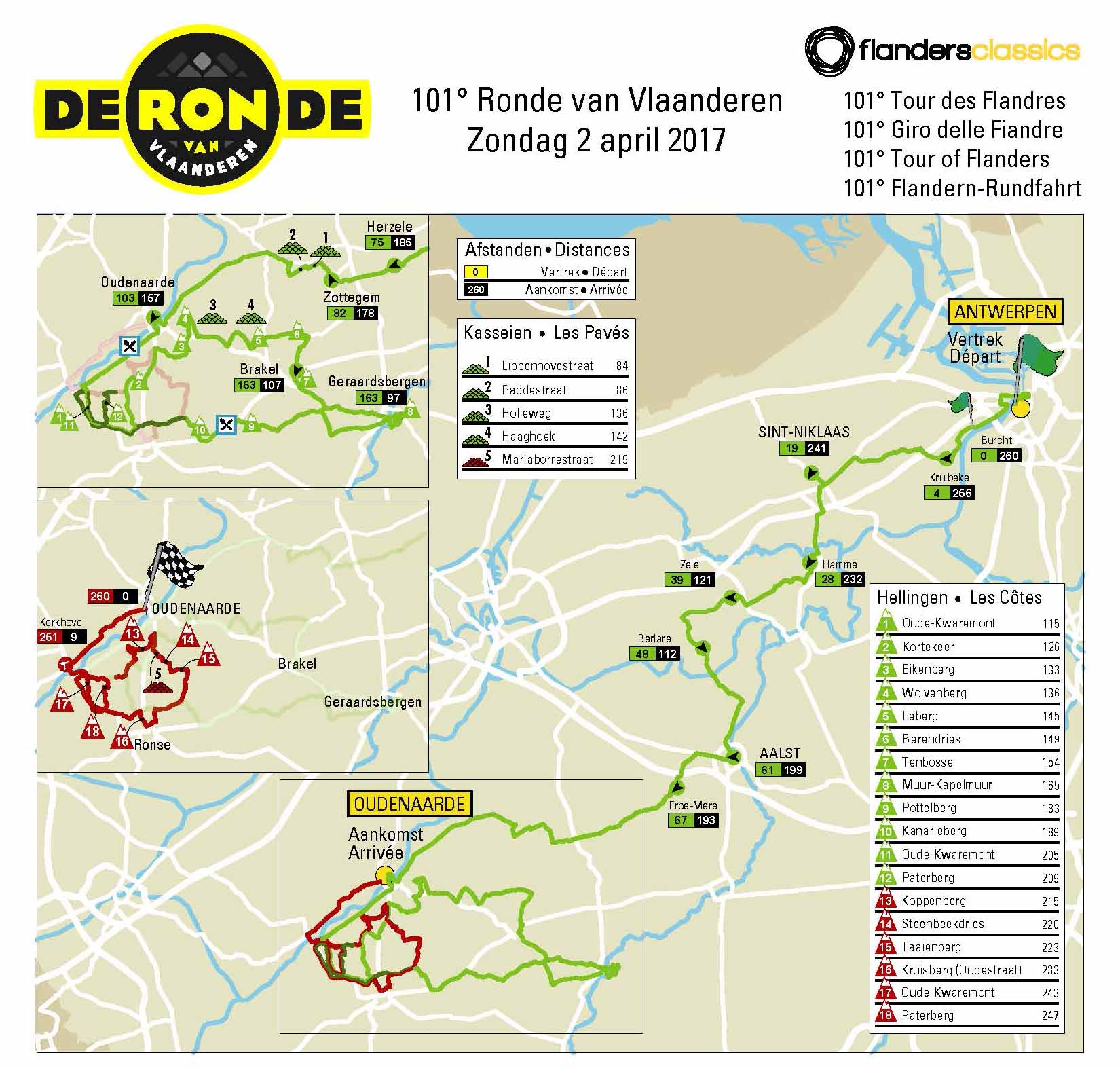 La prima grande novità di quest’anno è la partenza da Anversa, dopo quasi vent’anni in cui il via veniva dato da Bruges. Prima parte della corsa che appare piuttosto tranquilla, poi si entra nel cuore delle Fiandre e, dopo 83 chilometri, si presentano i primi due settori pianeggianti in pavé.