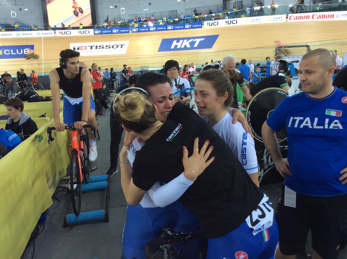 Lacrime, abbracci, grande festa in tutto il clan azzurro, che ha accompagnato in coro l’Inno di Mameli, il primo ascoltato in questi Mondiali al velodromo di Hong Kong.