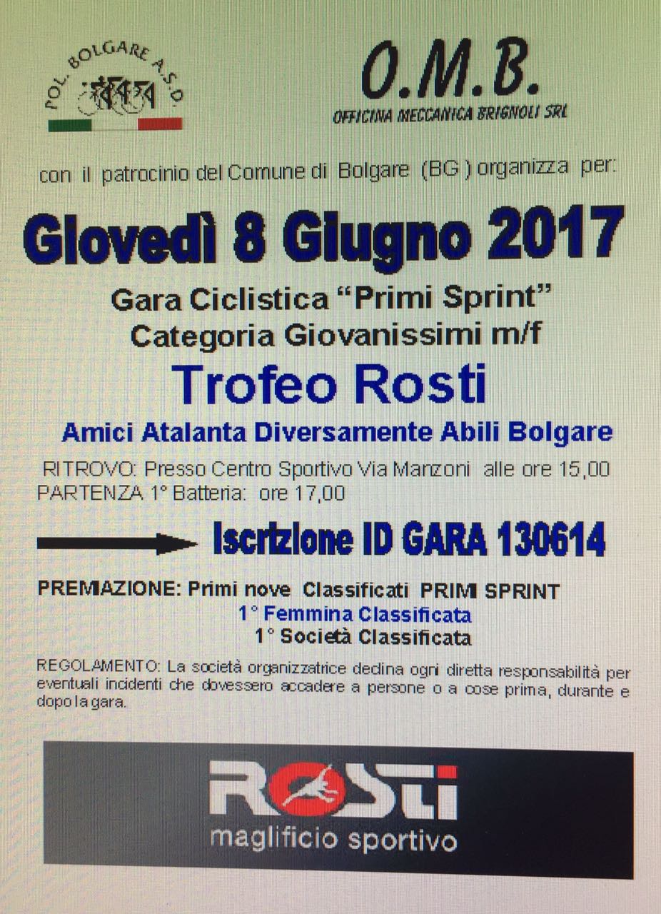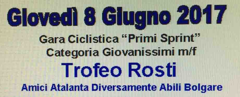 BOLGARE (BG) – Giovedì 8 giugno con ritrovo alle ore 15 e partenza alle 17, sulla pista del Centro Sportivo di Bolgare (Scuola di Ciclismo CONI) è in programma il Trofeo Rosti – Amici Atalanta Bolgare, gara Primi Sprint riservata alla categoria Giovanissimi.