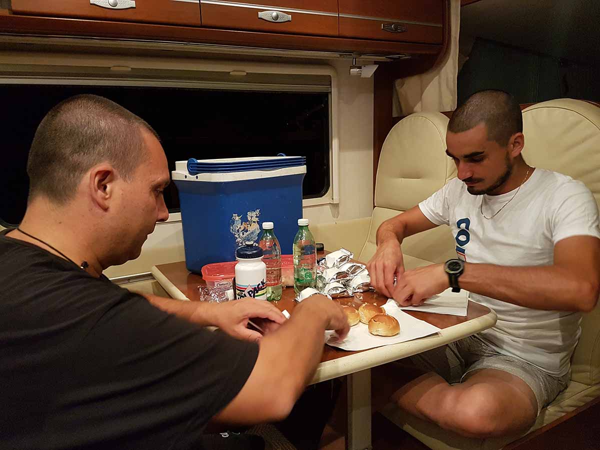 Ci si alza molto presto, ed i primi sono i massaggiatori, si preparano rifornimento, si puliscono i mezzi, si sistemano le biciclette, si finiscono i lavaggi panni che non si sono fatti la sera prima, si guardano i percorsi, ci si mette d’accordo su tagli da fare per dare più volte l’acqua ai ragazzi e ci si organizza già per il giorno dopo. Insomma il nostro Giro parte prima degli atleti e finisce sempre tre o quattro ore dopo la loro tappa perché comunque i rifornimenti come i panini ed il riso per il dopo gara viene sempre fatto la sera.