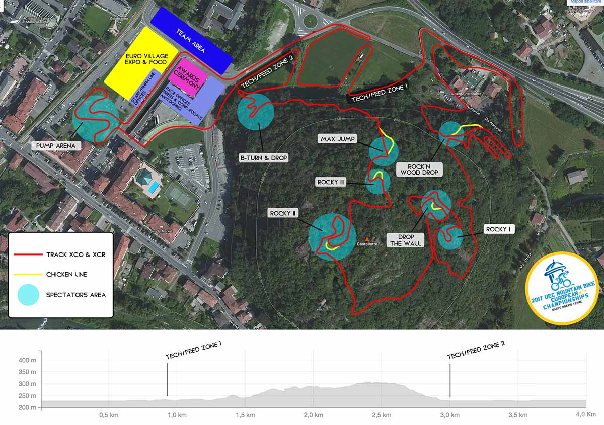 L’intera logistica prenderà vita a due passi dal centro di Darfo Boario Terme, sfruttando le strutture del Centro Congressi di via Romolo Galassi, gli ampi spazi che le circondano e l’oasi naturale offerta dal Mte. Castellino che sorge a soli 100mt dalla zona di partenza/arrivo. 4000mt con 150mt di dislivello sono le caratteristiche dell’anello di gara che ospiterà le competizioni XCO e XCR, 700mt misurerà invece il tracciato per l’XCE che ne ricalcherà la parte iniziale e finale con l’aggiunta di qualche ostacolo in più.
