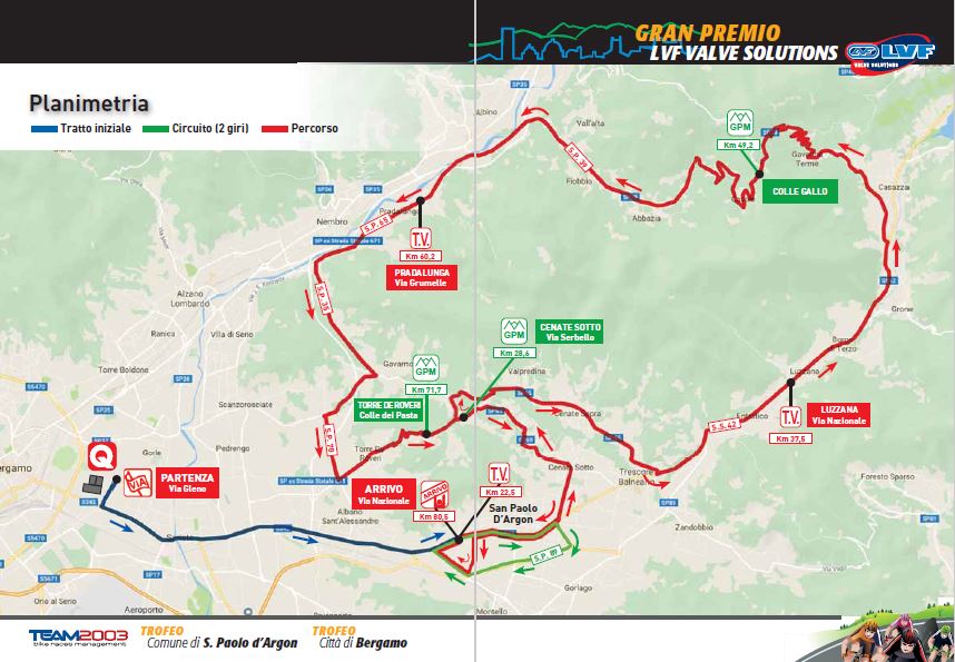 Primo circuito (3 giri – 10,76 km): Clusone-Rovetta-Loc. San Lorenzo-Loc. Fiorine-Clusone-P.zza Baradello;