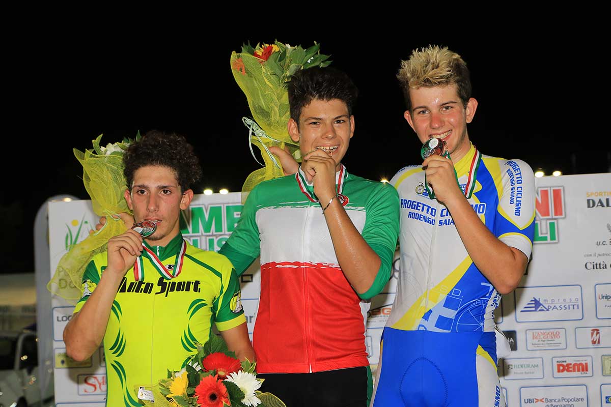 Il 16enne di Soiano del Lago ha indossato la prima maglia tricolore della sua carriera. Medaglia d’argento per l’emiliano Samuele Barbato (Uc Sozzigalli) con secondo con 17 punti e medaglia di bronzo per l’altro bresciano Matteo Corini (Progetto Ciclismo – Rodengo Saiano) terzo con 17 punti.