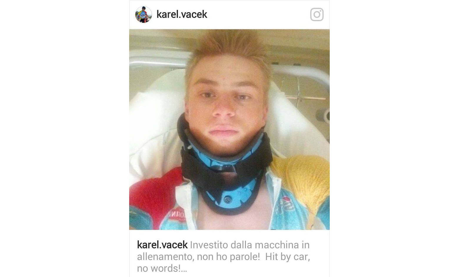 Fortunatamente il giovane ciclista ha riportato solo delle forti contusioni, ma nessuna frattura e nulla di grave come ci ha confermato anche il suo direttore sportivo Marco Cattaneo. Karel ha postato sui social una foto con il collarino con il testo “Investito da una macchina in allenamento, non ho parole!”