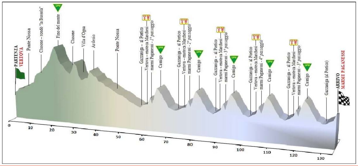 Domenica 27 agosto per il 47° Trofeo Emilio Paganessi confermate le cinque scalate al Casnigo. Partenza alle ore 9 sempre da via Ferrari a Vertova e classico arrivo alla Marmi Paganessi per un totale di 134 chilometri. In mezzo, dopo un primo tratto in linea di andata e ritorno verso l’Alta Valle Seriana, i corridori dovranno affrontare per cinque volte la salita di Casnigo durante i cinque giri del circuito finale. Lo scorso anno la gara fu vinta dallo svizzero Marc Hirschi che giusto pochi giorni fa ha conquistato la medaglia di bronzo all’Europeo su strada degli Under 23.