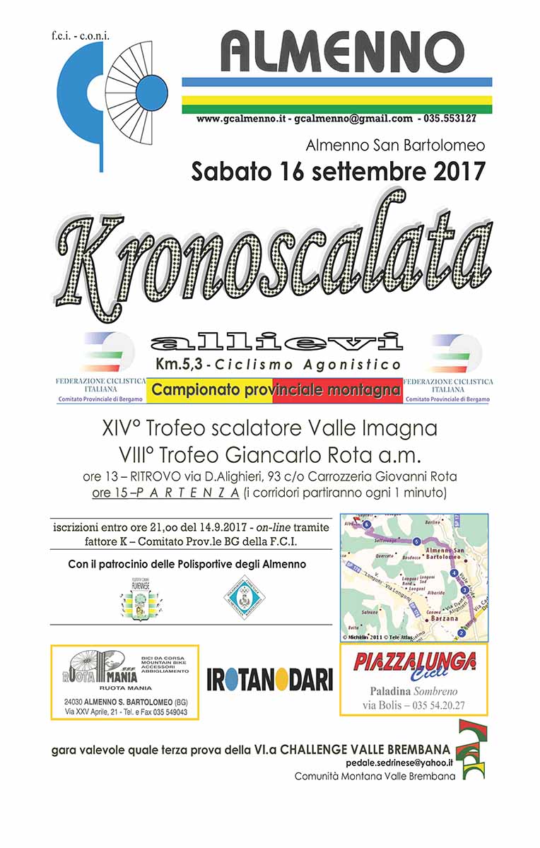 ALMENNO SAN BARTOLOMEO (BG) – Sabato 16 settembre da Almenno San Bartolomeo ad Albenza, si svolgerà la classica cronoscalata per Allievi abbinata al 14° Trofeo Scalatore Valle Imaga – 8° Trofeo Giancarlo Rota a.m.