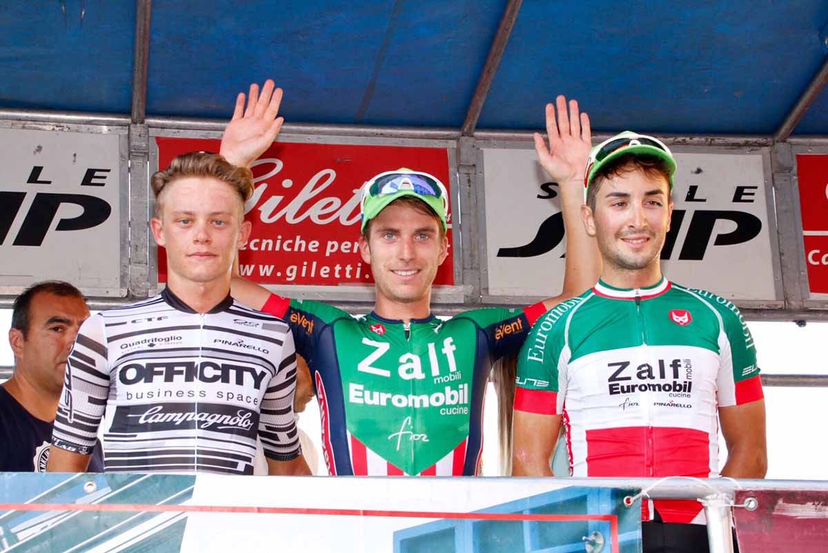 SONA (VR) – Festa Zalf Euromobil Désirée Fior sul traguardo di Sona (Verona) dove oggi si è concluso il 54° Gran Premio San Luigi. Il corridore veneto Nicolò Rocchi ha superato il compagno di fuga Matteo Fabbro (Cycling Team Friuli) avendo la meglio sullo strappetto finale. Terzo a un minuto il campione italiano Elite Gianluca Milani (Zalf Euromobil Désirée Fior) che ha regolato la volata del gruppo.