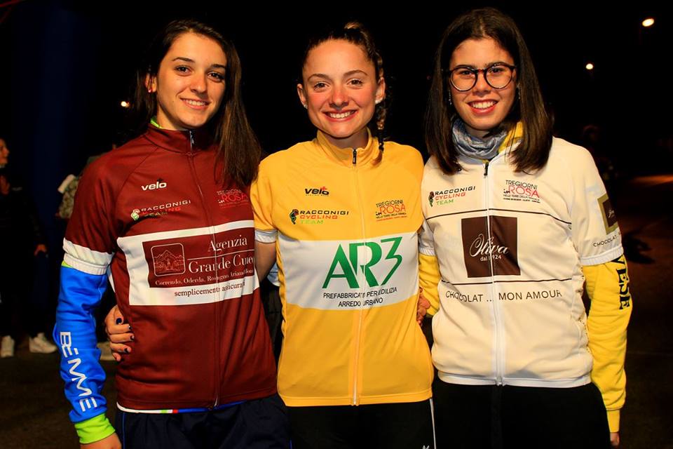 Carlotta Cipressi, Eleonora Gasparrini e Chiara Consonni hanno guadagnato cento punti nella classifica generale della Tre Giorni in Rosa in virtù del loro primo posto nella prima prova. Domani partiranno con la maglia di leader della classifica generale. Cipressi indosserà la maglia bianca, Gasparrini la maglia bordeaux e Consonni la maglia gialla. Le seconde classificate hanno guadagnato novanta punti, le terze ottanta, le quarte settanta e le quinte sessanta. Le atlete dalla sesta all’ultima hanno guadagnato trenta punti, le atlete ritirate quindici. La prova di domani – il Trofeo Città di Cuneo – si correrà a Cuneo e sarà una cronometro individuale di un chilometro e mezzo nel centro del capoluogo della provincia Granda. Il ritrovo è alle 16, la prima partenza alle 18.