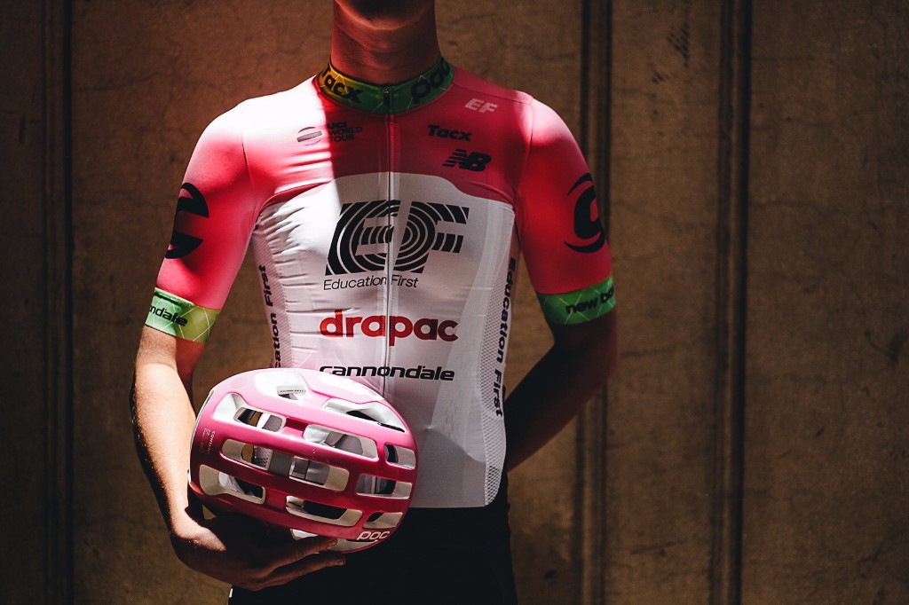 LONDRA (GRAN BRETAGNA) – Slipstream Sports ha svelato ufficialmente la divisa 2018 del Team EF Education First – Drapac p/b Cannondale alla Rouleur Classic di Londra ieri pomeriggio. Il campione svedese Kim Magnusson ha indossato il nuovo kit che comprende anche il casco bianco e rosa realizzato da Poc, azienda svedese il cui logo apparità anche sul retro della maglia. La maglia appunto: bianca e rosa, con bordo sulle maniche e sul collo color verde Cannondale. Ovviamente sulla divisa campeggia il marchio del nuovo title partner della squadra, EF Education First. Anche uno degli uomini simbolo della squadra come Rigoberto Uran ha già indossato il nuovo kit (nella foto).