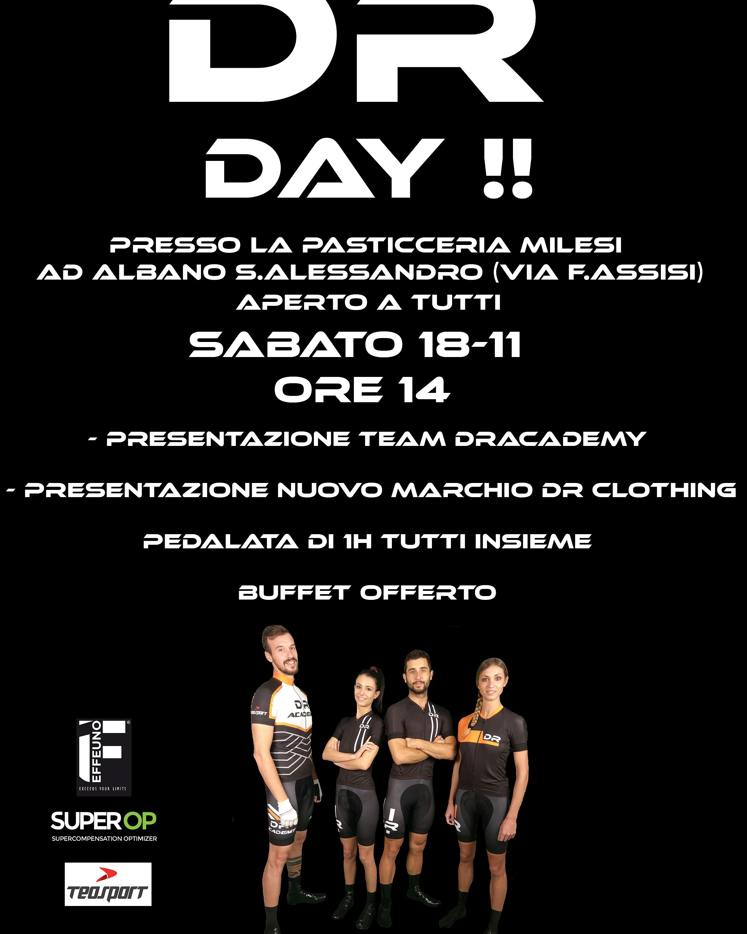 ALBANO SANT’ALESSANDRO (BG) – Sabato 18 novembre è il DR Day. Dalle ore 14 presso la Pasticceria Milesi in via F. d’Assisi ad Albano Sant’Alessandro l’ex professionista Daniele Ratto propone agli appassionati di bicicletta un pomeriggio allettante con la presentazione del Team DR Academy e del nuovo marchio di abbigliamento Dr Clothing. Per i partecipanti ci sarà anche la possibilità di fare una pedalata di un ora tutt’insieme. A conclusione un sarà offerto un buffet.