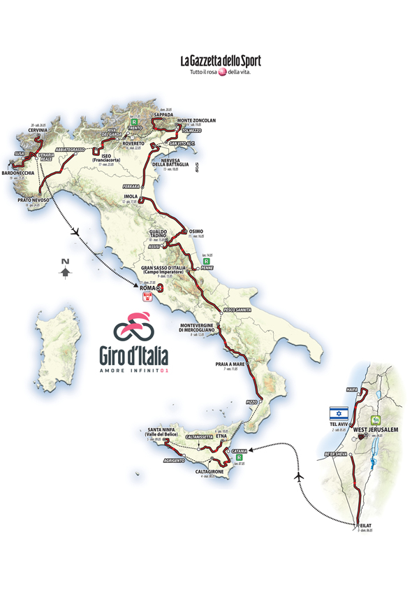 Già note le prime tre fazioni in Israele. Il via da Gerusalemme venerdì 4 maggio, con una crono di 10 chilometri. Altre due tappe in Israele, poi Haifa-Tel Aviv, di 167 km e la terza tappa Be’er Sheva-Eilat, di 229 km.