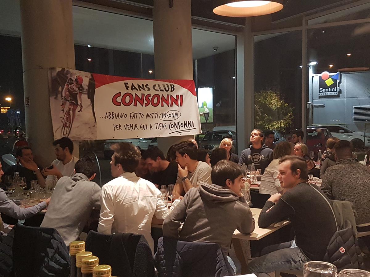 BERGAMO (BG) – Il Fans Club Consonni si è radunato lo scorso sabato sera per celebrare la prima annata da professionista del ciclista bergamasco Simone Consonni. Soprattutto parenti e amici e coloro che lo hanno seguito fin da bambino hanno voluto esprimergli tutto l’affetto. Presente il suo primo allenatore nelle categorie Esordienti e Allievi alla Pol. Marco Ravasio Angelo Belloli, l’ex professionista Gianluca Valoti, suo direttore sportivo tra i dilettanti al Team Colpack e il CT della Nazionale pista Marco Villa. E a proposito di pista non sono voluti mancare nemmeno i compagni del quartetto Filippo Ganna e Liam Bertazzo.