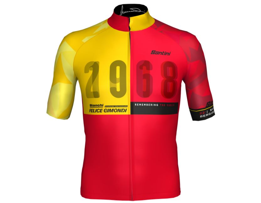 Interamente rossa nella metà inferiore, la maglia utilizza i colori nazionali della Spagna, giallo e rosso, nella parte anteriore che al centro, all’altezza del petto, presenta in sovrapposizione le scritte 1968 e 2018, a celebrare il 50° anniversario della Vuelta vinta da Gimondi. Al di sotto delle due date sovrapposte, sulla destra il logo della GF Bianchi Gimondi, a sinistra su sfondo nero la scritta “Remembering the Vuelta”; più in alto, il logo Santini, che torna sulla manica destra, dove sono ricordate la data, il luogo e il numero 22, che caratterizzano la prossima edizione della granfondo. Sulle spalle, il logo della Vuelta Ciclistica a España del 1968, che si corse dal 25 aprile al 12 maggio, mentre all’altezza della schiena, sulla tasca centrale, tornano le due date 1968 e 2018.