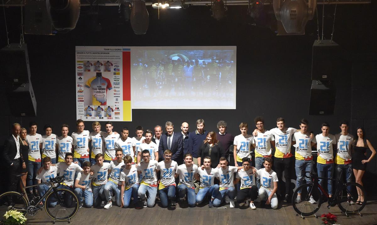 TORRE DE’ ROVERI (BG) – Un pezzo di storia del ciclismo. Vent’anni di storia di uomini e di ragazzi, di vittorie e di sconfitte, di amicizia e di grande passione. Vent’anni di vita del Team F.lli Giorgi sono stati festeggiati nella serata di venerdì 15 dicembre a Seriate dove il presidente Carlo Giorgi ha voluto chiamare a raccolta tanti amici, sponsor e collaboratori che insieme a lui hanno reso possibile questa meravigliosa avventura ciclistica. Protagonisti anche una quarantina di ragazzi tra coloro che dal 1997 al 2016 hanno portato alla vittoria la maglia del Team Giorgi, oltre, ovviamente, a quei ragazzi che tra Allievi e Juniores si sono resi protagonisti della stagione 2017, quella dei record, e anche i volti nuovi che questa gloriosa maglia del sodalizio bergamasco la vestiranno nel 2018 (nella foto Rodella, sopra, la squadra 2018.