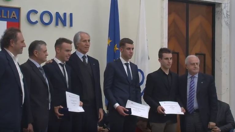 ROMA (RM) – Il Salone d’Onore del CONI ha ospitato questa mattina il tradizionale Giro d’Onore, il momento nel quale a fine anno la Ferazione Ciclistica Italiana omaggia tutti i suoi campioni. A fare gli onori di casa ovviamente il presidente della Federciclismo Renato Di Rocco, il presidente del CONI Giovanni Malagò, il segretario generale della FCI Maria Cristina Gabriotti e il segretario generale dell’UEC Enrico Della Casa.