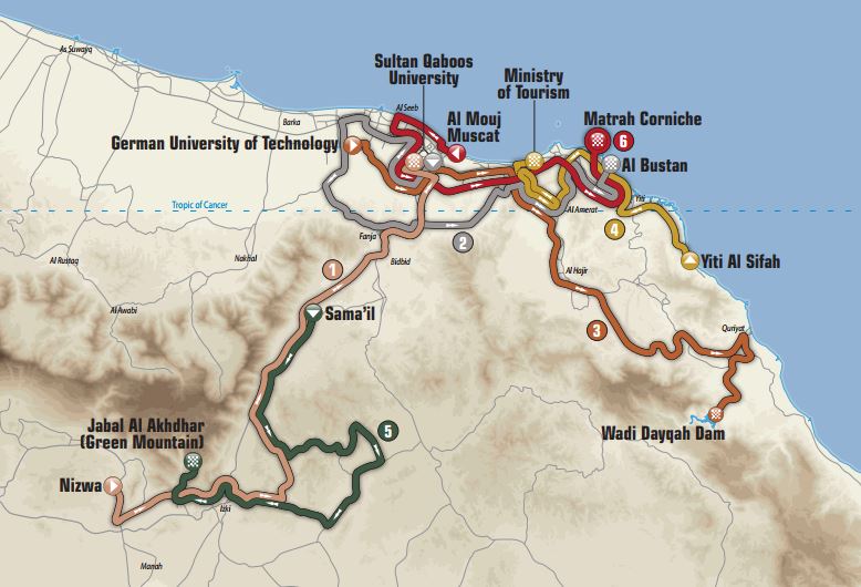 MASCATE (OMAN) – Svelato oggi il percorso della nona edizione del Tour of Oman, la corsa a tappe che dal 13 al 18 febbraio 2018 si svolgerà nel Sultanato. In totale sono sei le tappe per complessivi 914,5 chilometri. Per l’ottavo anno consecutivo verrà proposto l’arrivo più difficile della gara, quello in salita con traguardo posto a Jebel Akhdar (Green Mountain), 5,7 km di ascesa con pendenze medie al 10,5%.