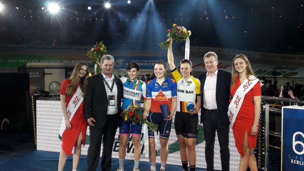 “Sono molto contenta per come è andata” racconta l’atleta classe’93, bronzo ai recenti europei nell’Eliminazione e vincitrice proprio nella stessa prova a Berlino “c’era un gran bel roster di partenti e come al solito l’atmosfera della Sei Giorni è stata fantastica. Nonostante arrivassimo da una settimana molto impegnativa, Elisa ed io ce la siamo cavata bene con la ciliegina sulla torta della vittoria nell’americana e questo secondo posto nella classifica finale” (nella foto il podio finale).