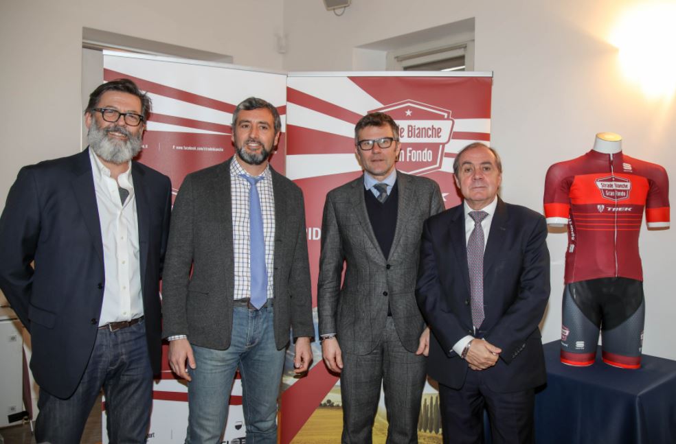 Da sinistra:il Responsabile Area Mass Event di RCS Sport Andrea Trabuio, l’Assessore allo sport di Siena Leonardo Tafani, il Direttore Generale di RCS Sport Paolo Bellino e il Direttore dell’Area Ciclismo di RCS Sport Mauro VegniCome sottolineato dall’Amministrazione Comunale di Siena: <<La “Strade Bianche”, ormai tra le principali competizioni professionistiche mondiali, rappresenta uno degli appuntamenti più importanti per il territorio senese, sia dal punto di vista strettamente sportivo per il livello dei partecipanti sia per il ritorno di immagine generato dalla sua copertura mediatica. L’Amministrazione comunale, sotto la cui egida è cresciuto il brand “Strade Bianche” anche con l’organizzazione della gara femminile e di quella amatoriale, continuerà a sostenerne l’organizzazione e la promozione, nella certezza che la corsa continuerà a crescere ulteriormente in termini di rilevanza e di visibilità, anche grazie alla collaborazione di tutti i Comuni coinvolti. Questo è dimostrato dalla volontà di tutte le istituzioni del territorio, nonostante la concomitanza con le elezioni politiche del 4 marzo, di fare uno sforzo ulteriore – insieme agli organizzatori – per la buona riuscita di tutte le manifestazioni>>.