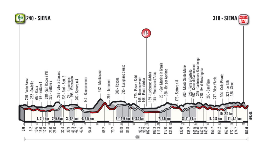 Gli ultimi km si snodano per la prima parte all’esterno dell’abitato di Siena su strade larghe e lunghi rettifili collegati tra loro da ampie curve, prima in discesa e poi in leggera salita fino ai 2 km dall’arrivo dove viene imboccata la via Esterna di Fontebranda con pendenze fino al 9%. A 900 m dall’arrivo si supera la Porta di Fontebranda e inizia la pavimentazione lastricata. La pendenza supera il 10% fino a raggiungere attorno ai 500 m dall’arrivo, in via Santa Caterina, punte del 16%. Segue una svolta decisa a destra nella via delle Terme e l’immissione in via Banchi di Sotto. Dai 300 m la strada è sempre in leggera discesa. Ai 150 m svolta a destra in via Rinaldini. Ai 70 m si entra nel Campo, ultimi 30 in discesa al 7%, traguardo pianeggiante.