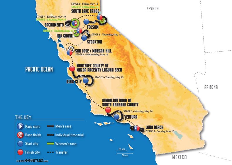 In totale saranno 1.038 i chilometri percorsi dal Sud al Nord della California, suddivisi in sette tappe da Long Beach a Sacramento dal 13 al 19 maggio. Hanno già confermato la propria presenza tre dei più importanti campioni del pedale: Mark Cavendish (Team Dimension Data), Marcel Kittel (Team Katusha Alpecin) e il tre volte iridato Peter Sagan (BORA-hansgrohe).