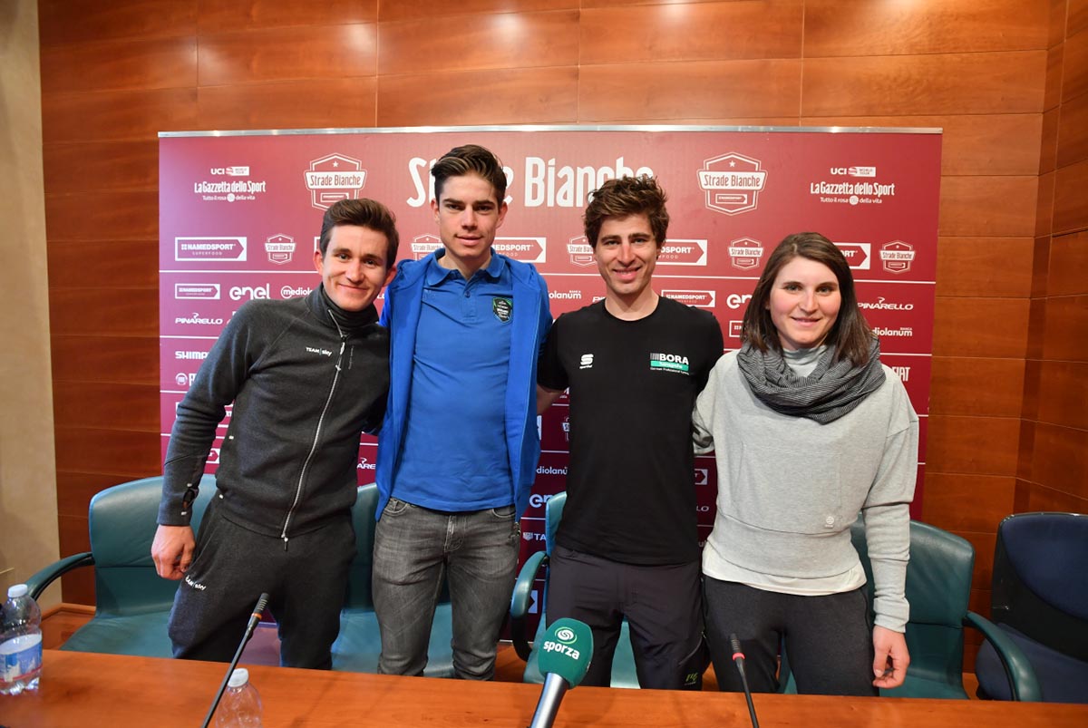 SIENA (SI) – La conferenza stampa della vigilia della Strade Bianche NamedSport e della Strade Bianche Women Elite NamedSport, entrambe prove del circuito UCI WorldTour, ha visto come protagonisti il Campione del Mondo su strada UCI Peter Sagan, il Campione del Mondo Ciclocross UCI, Wout Van Aert ed i vincitori della scorsa edizione, Michał Kwiatkowski ed Elisa Longo Borghini, nella splendida cornice di Palazzo Sansedoni – Fondazione Monte dei Paschi (Quartier Generale della Corsa), in Piazza del Campo a Siena (foto LaPresse – Ferrari / Paolone).