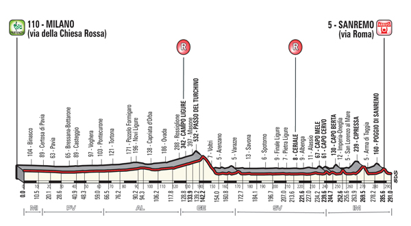 PERCORSOLa Milano-Sanremo NamedSport si svolge sul percorso classico che negli ultimi 109 anni ha collegato Milano con la riviera di Ponente attraverso Pavia, Ovada, il Passo del Turchino per scendere su Genova Voltri. Da lì si procede verso ovest attraverso Varazze, Savona, Albenga fino a Imperia e San Lorenzo al Mare dove, dopo la classica sequenza dei Capi (Mele, Cervo e Berta), si affrontano le due salite inserite negli ultimi decenni: Cipressa (1982) e Poggio di Sanremo (1961). La Cipressa misura 5,6 km ad una pendenza media del 4,1% e presenta una discesa molto tecnica che riporta sulla SS1 Aurelia.