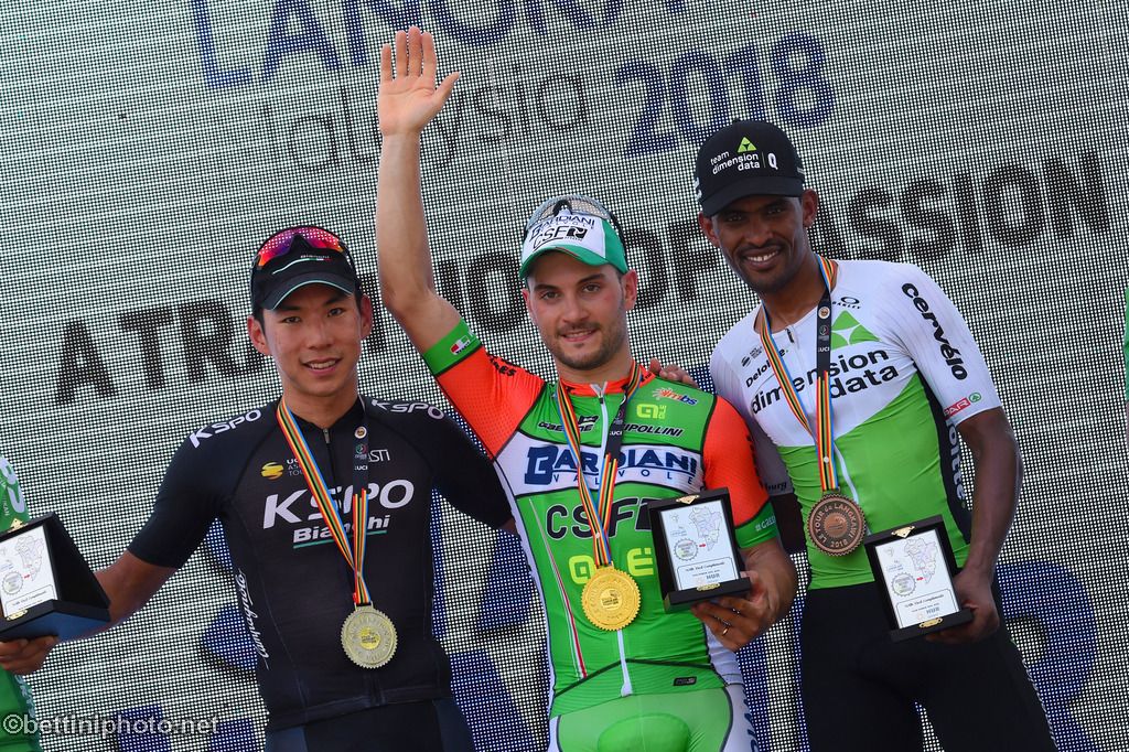 Sul podio della prima tappa, insieme a Guardini, sono saliti il coreano Seo (KSPO-Bianchi) e Debesay (Dimension Data). Il veronese è stato ovviamente premiato anche come primo leader della classifica generale (6″ su Seo, grazie agli abbuoni) e di quella a punti (19 contro i 12 di Seo).