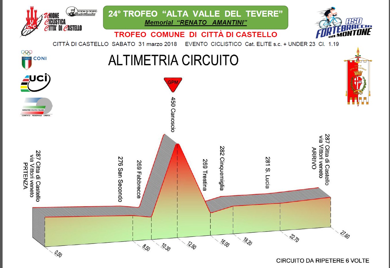 CITTÀ DI CASTELLO (PG) – È tutto pronto per il 24° Trofeo Alta Valle del Tevere – Memorial Renato Amantini – Trofeo Comunde di Città di Castello riservato alla categoria Elite e Under23 che si correrà sabato 31 marzo a Città di Castello. Sono 176 i corridori iscritti che alle ore 13.30 prenderanno il via da Via Vittorio Veneto.
