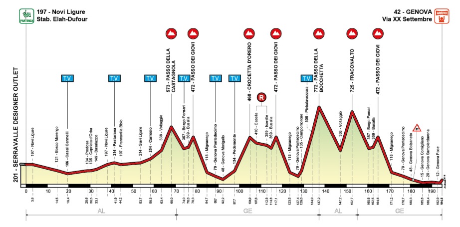 Le novità non riguardano solo la sede di arrivo, ma anche il ritrovo di partenza, che avverrà presso il Designer Outlet di Serravalle, mentre le operazioni preliminari non si terranno più al Retail Park di Serravalle, ma all’interno della Casa della Salute di Busalla. Per quello che riguarda il percorso, invece, spicca un altro gradito ritorno, quello del Passo della Bocchetta, affrontato dal versante di Campomorone. Una sorta di ritorno alle origini, che farà sicuramente piacere agli appassionati della corsa. Inedito invece l’ultimo GPM della giornata, che sarà probabilmente quello decisivo: il passaggio da Fraconalto, che si raggiunge dopo una salita di 5,5 km, con dei picchi di pendenza che arrivano a sfiorare il 10%; le altre asperità tornano ad essere le più classiche, il Passo della Castagnola, il Passo dei Giovi, affrontato per tre volte e Crocetta d’Orero, oltre che la già citata Bocchetta. Istituiti anche sette traguardi volanti (Casal Cermelli, Pasturana, Carrosio, Borgo Fornari, Pontedecimo, Pedemonte e Pietralevezzara).