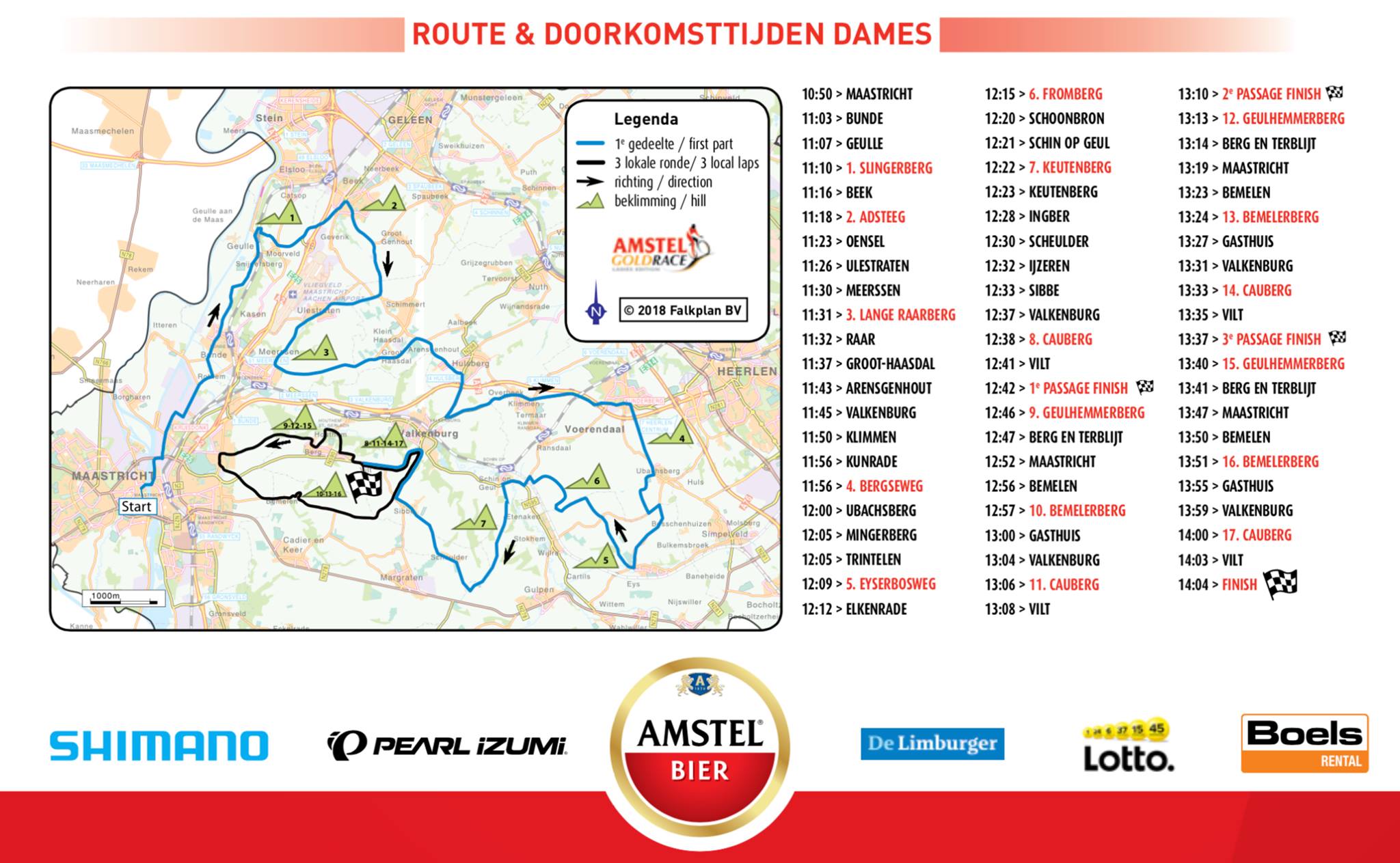 A differenza degli anni scorsi però nell’ultimo giro, di 16 chilometri non ci sarà il Cauberg. Dopo il Geulhemmerberg, una delle oltre trenta côte in programma, anziché imboccare una strada dritta e larga, come succedeva negli anni scorsi, i corridori faranno una discesa stretta e tecnica, il Klutenbergweg. Nel finale ci sarà ancora il Bemelerberg che sarà seguito nuovamente da strade ondulate e piene di curve a differenza del 2017. Leo Van Vliet, ex ciclista e organizzatore della Amstel Gold Race ha detto: “Con queste modifiche al finale della Amstel Gold Race abbiamo cercato strade più strette per rendere difficile il controllo della corsa da parte del gruppo”. L’arrivo sarà nel comune di Valkenburg dopo 263 chilometri.