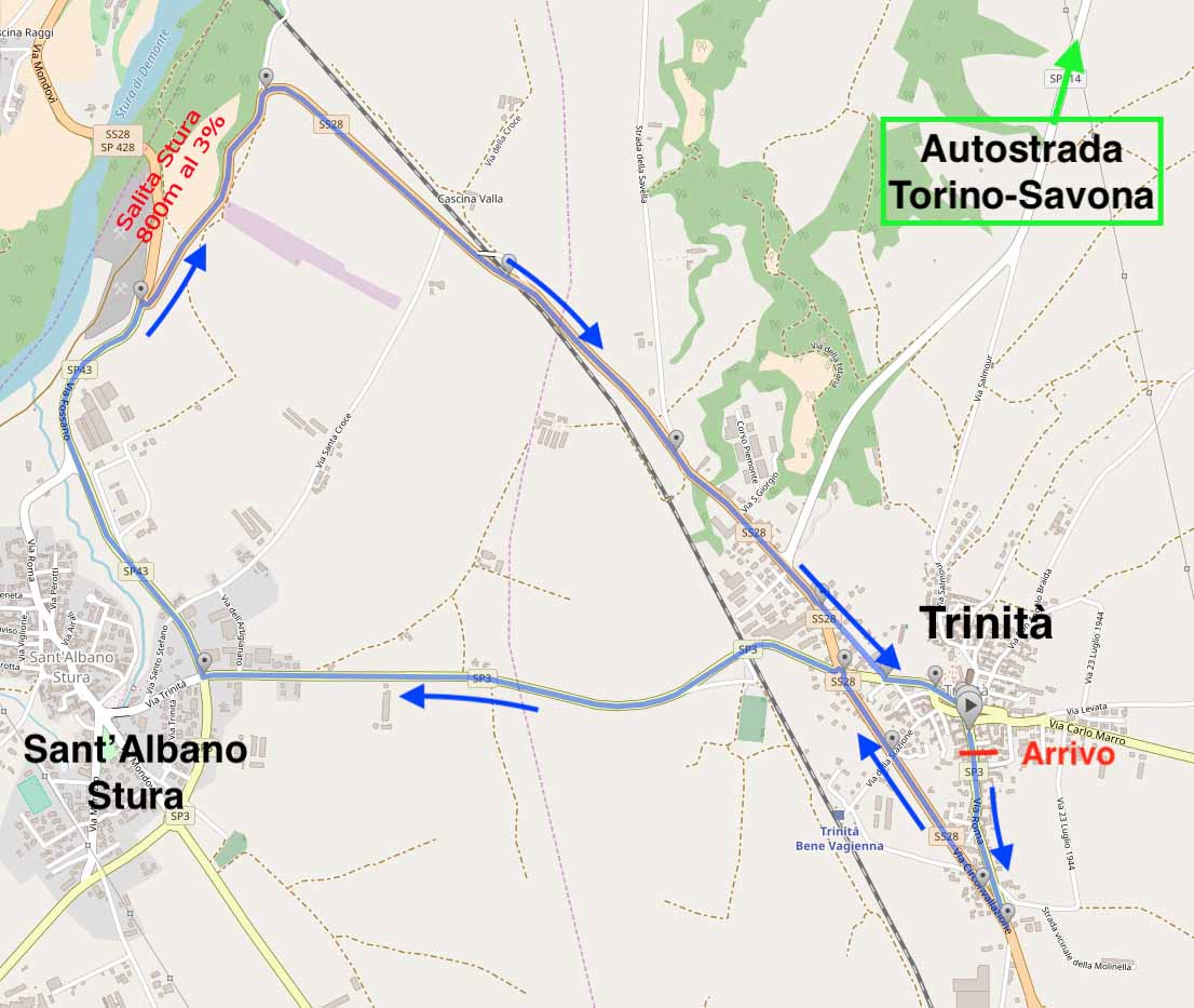 La prova si correrà su un circuito di 9 chilometri che attraversa i comuni di Trinità, ovviamente, e di Sant’Albano Stura. La difficoltà principale sarà la salita di Stura, uno strappo di 800 metri con pendenza media tra il 2 e il 3 per cento. Partenza e arrivo saranno in via Roma, nel centro di Trinità, che ha già ospitato diverse gare ciclistiche giovanili e amatoriali.