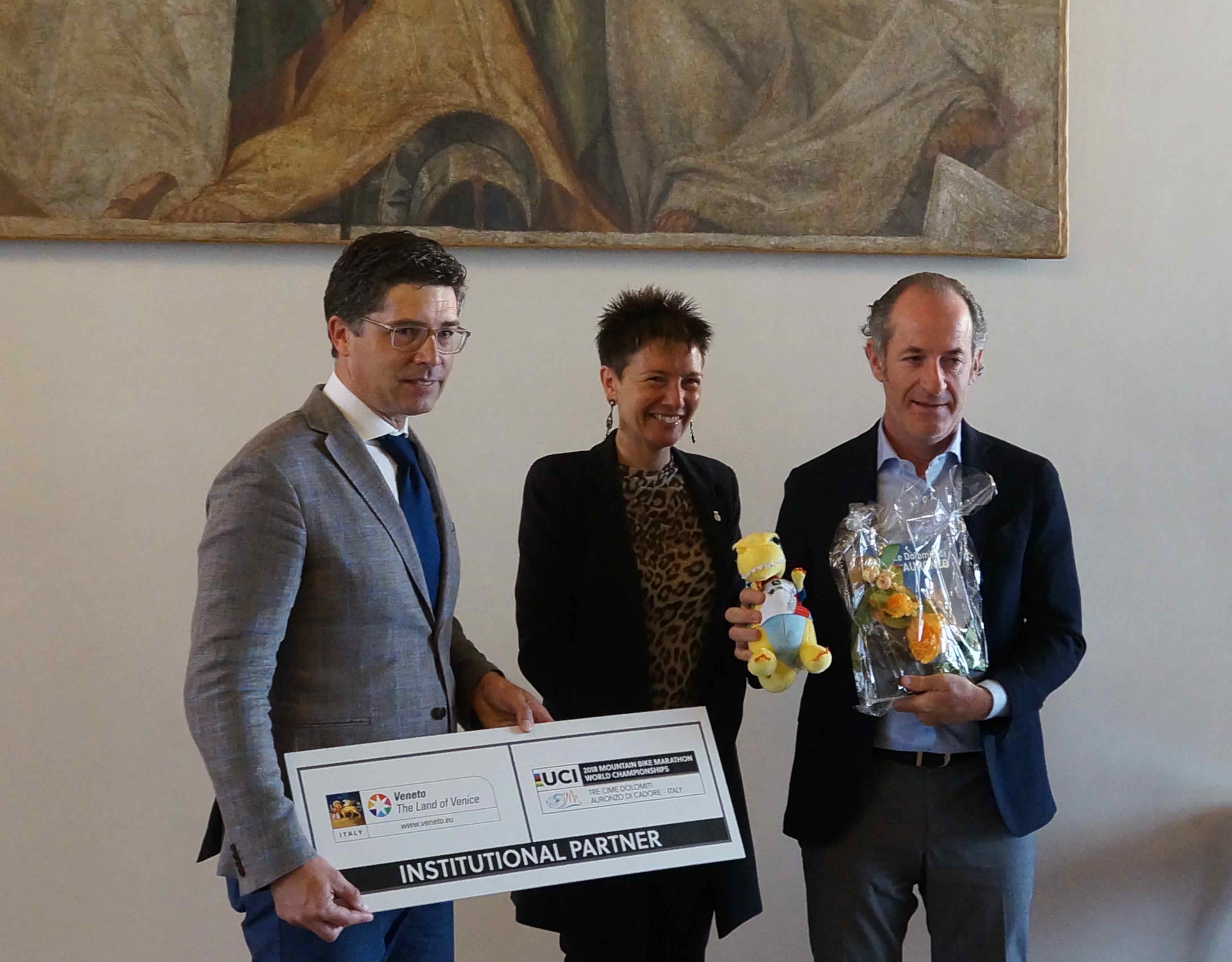 Durante la conferenza è stato proiettato il video ufficiale dell’UCI MTB Marathon World Championships 2018: un viaggio emozionaledal Palazzo Ducale di Venezia alle Tre Cime fino ad Auronzo di Cadore, disponibile al link http://world.3epic.it/?p=video. Al Presidente della Regione è stata poi donata la mascotte del mondiale Aurosauro, acronimo di Auronzo e Dinosauro, in ricordo delle tracce di dinosauro trovate ai piedi delle Tre Cime di Lavaredo.
