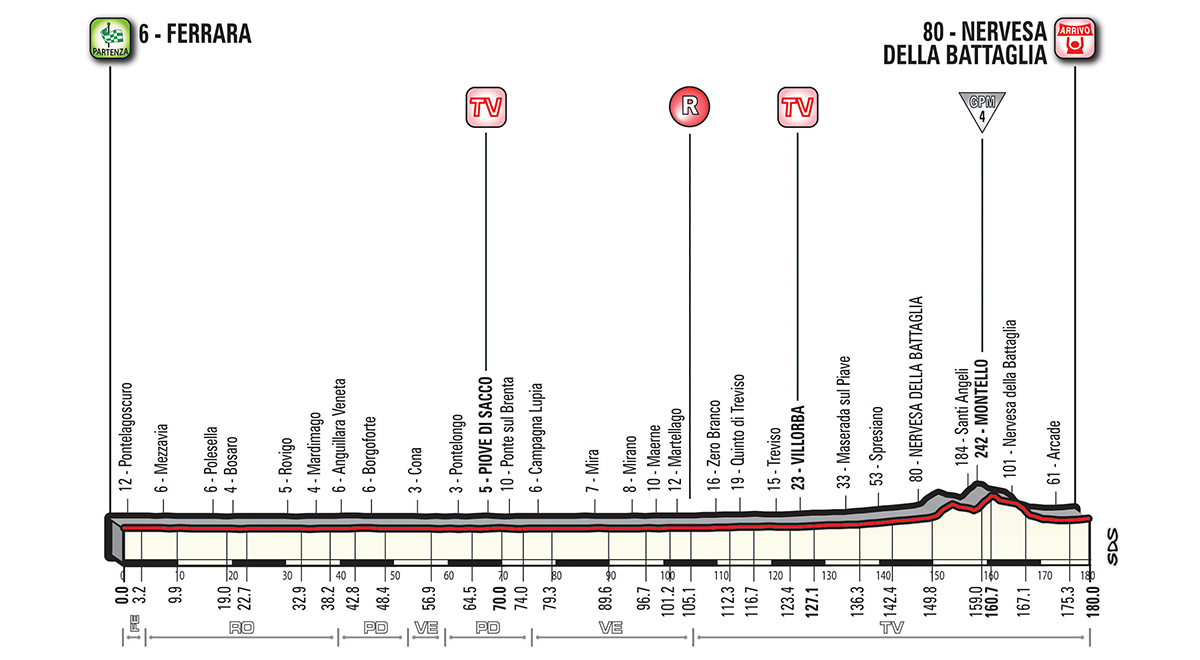 Tappa assolutamente piatta che attraversa la pianura Padana orientale da sud a nord. Da segnalare numerosi attraversamenti cittadini dove è possibile (e consueto) rotatorie, spartitraffico e dossi rallentatori. A 30 km dall’arrivo primo passaggio sul traguardo per affrontare il Montello da un versante “soft” con ultimo scollinamento a 20 km dall’arrivo. Ultimi km: ultimi chilometri tutti pianeggianti e con pochissime curve, ultima degna di nota a 5 km dal traguardo.