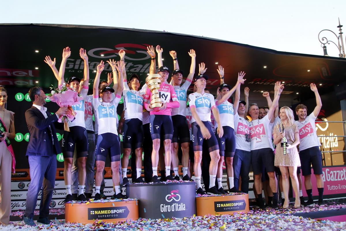 Dietro al trionfo di Chris Froome al Giro 101 c’è un lavoro di tutta una squadra, dai compagni, ai tecnici a tutto il personale. Una vittoria di gruppo più che mai. Nessuno si è mai perso d’animo nemmeno nei momenti più difficili, dopo le prime settimane quando, addirittura, si ventilava un possibile ritiro del britannico dalla Corsa Rosa. Tutti ci hanno sempre creduto, anche nel “miracolo” che il campione Chris Froome puntualmente a compiuto con quella azione straordinaria nella tappa di Bardonecchia. Un’impresa studiata a tavolino e applicata alla perfezione da tutto il team. La squadra simbolo del ciclismo moderno, quanto meno quella che ha sicuramente rivoluzionato il mondo del ciclismo negli ultimi anni, spesso accusata di troppi meccanicismi e quindi di togliere spettacolo alle corse, per un giorno ci ha regalato una delle tappe più memorabili che abbiamo mai visto negli ultimi decenni.